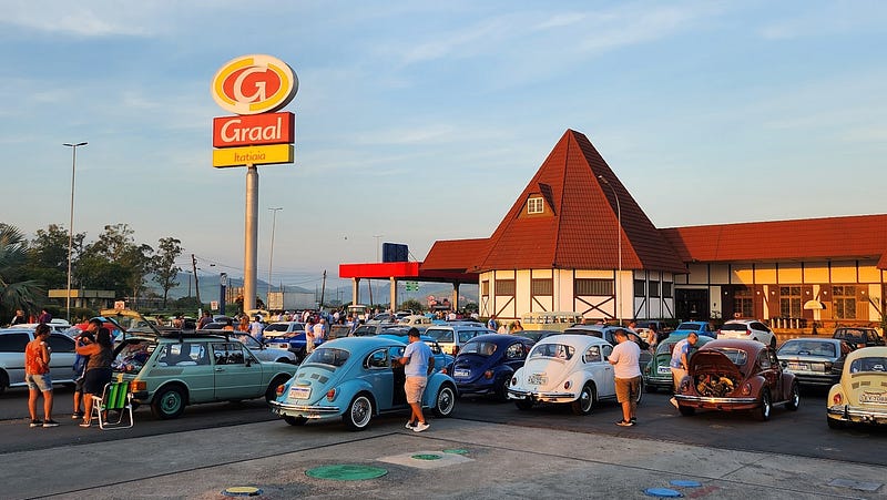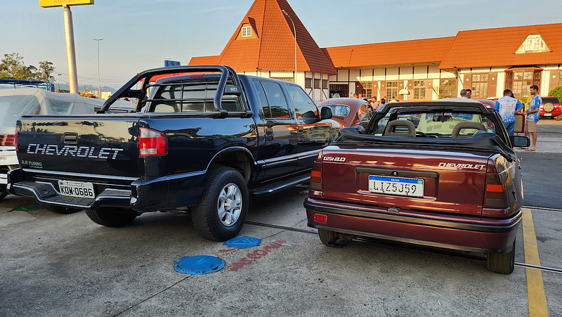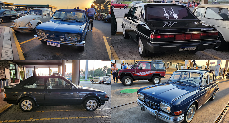 Incontáveis serras, reduções e ultrapassagem ditavam o ritmo, e davam a ordem: chegar logo. E assim fizemos, ao parar em um Graal para comer alguma coisa e esfriar os motores. Lanche feito, o sol começava a raiar, e tomei um susto: o que antes era um pátio vazio, havia virado um enorme encontro de carros antigos, dos mais diferentes tipos. Abaixo, alguns destaques.
