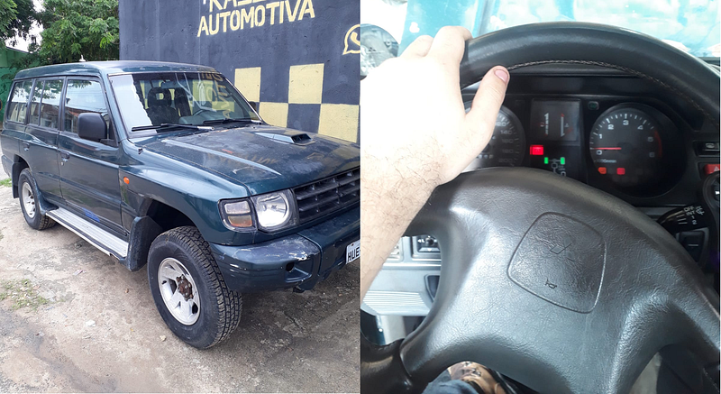 Enquanto viajava nas lembranças da época em que buscava um para chamar de meu, Flávio me interrompe para lembrar da sua paixão: o Mitsubishi Pajero, da primeira geração que veio ao Brasil. Ao mandar uma foto da primeira vez em que entrou e dirigiu uma, lembrei-me da felicidade dele no dia em que me mandara o registro, sem a menor questão de esconder a alegria em tê-la dirigido, ainda que pouco.