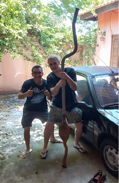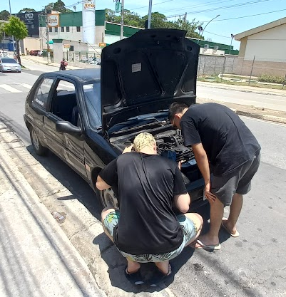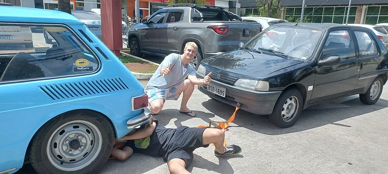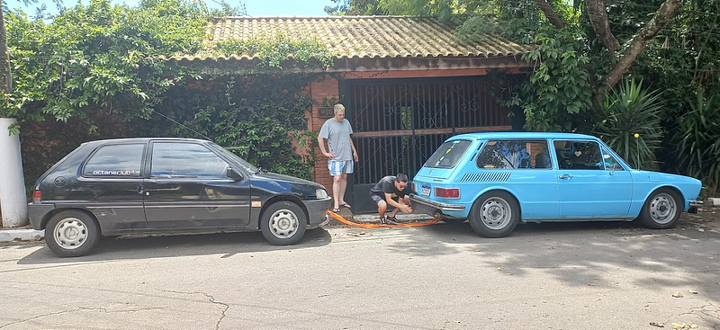 Na manhã seguinte, compramos uma corda e amarramos a Brasília ao Peugeot, a fim de completar os pouco mais de 2km entre o posto e a garagem do Gian. Para nossa sorte, o 106 pesa o mesmo que um fardo de Coca-Cola, então puxá-lo não seria um problema.